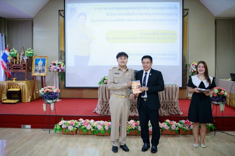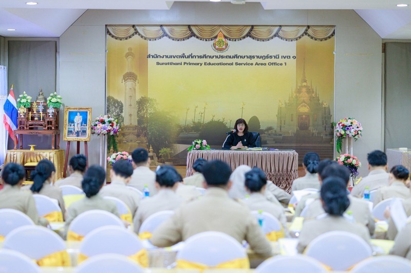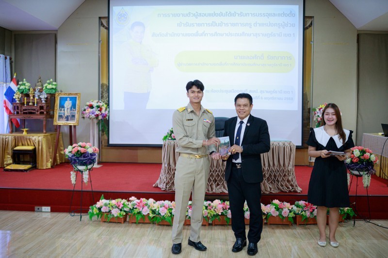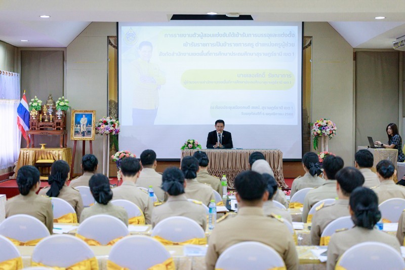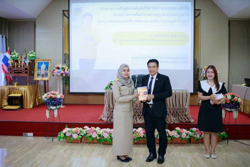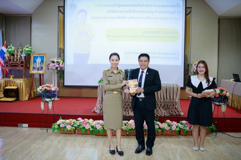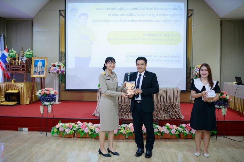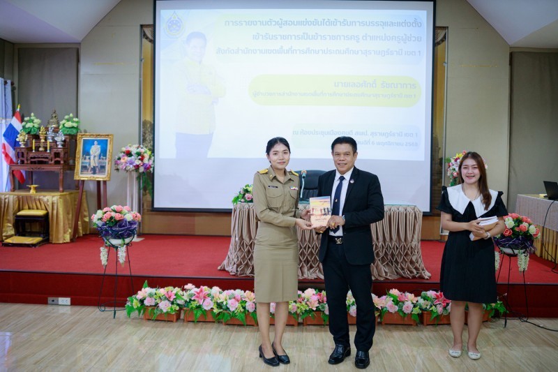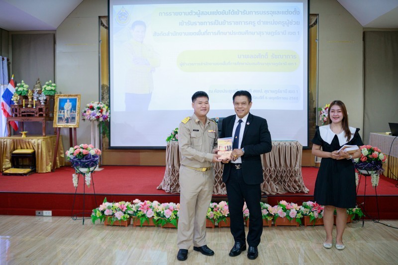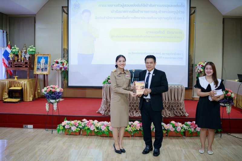วันที่ 6 พฤศจิกายน 2568 นายเลอศักดิ์ รัชณาการ ผู้อำนวยการสำนักงานเขตพื้นที่การศึกษาประถมศึกษาสุราษฎร์ธานี เขต 1 พร้อมด้วยนายวีระพันธ์ พรมคำน้อย รองผู้อำนวยการสำนักงานเขตพื้นที่การศึกษาประถมศึกษาสุราษฎร์ธานี เขต 1 และบุคลากรกลุ่มบริหารงานบุคคล ร่วมแสดงความยินดีและให้โอวาทในการทำงานเป็นข้าราชการที่ดีแก่ข้าราชการครูและบุคลากรทางการศึกษา ตำแหน่งครูผู้ช่วย สังกัดสำนักงานคณะกรรมการการศึกษาขั้นพื้นฐาน ปี พ.ศ. 2568 จำนวน 21 ราย ณ ห้องประชุมเมืองคนดี สำนักงานเขตพื้นที่การศึกษาประถมศึกษาสุราษฎร์ธานี เขต 1