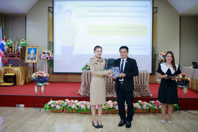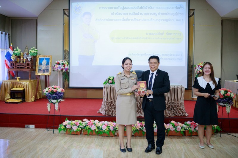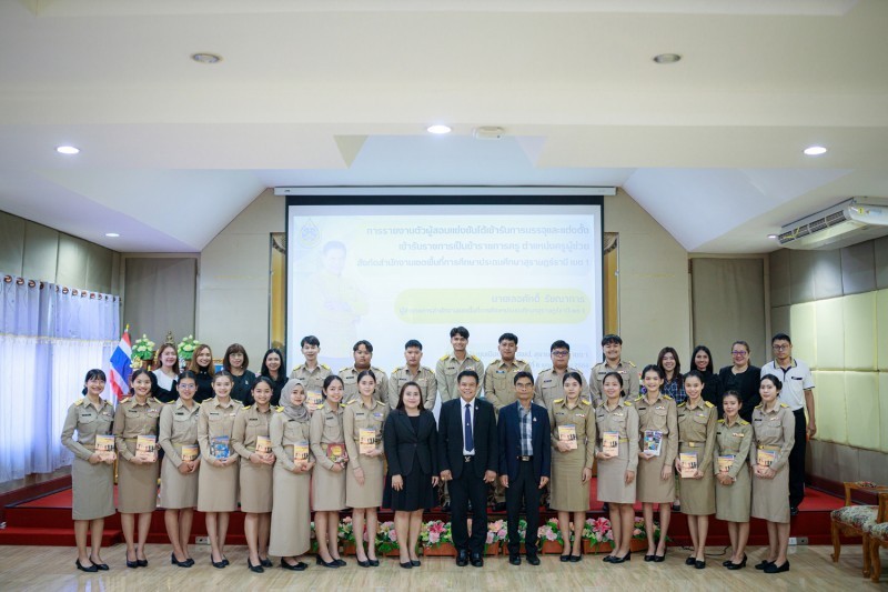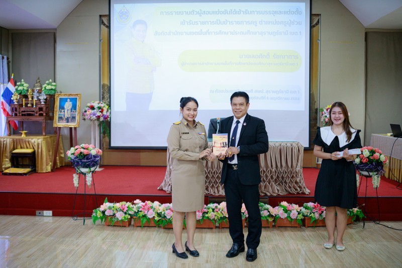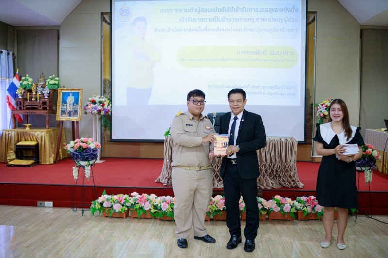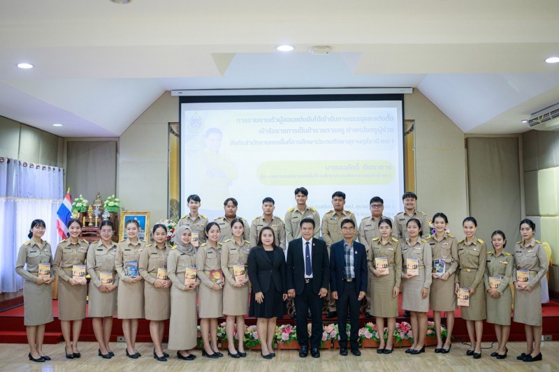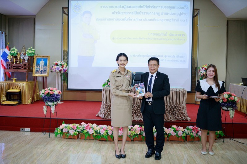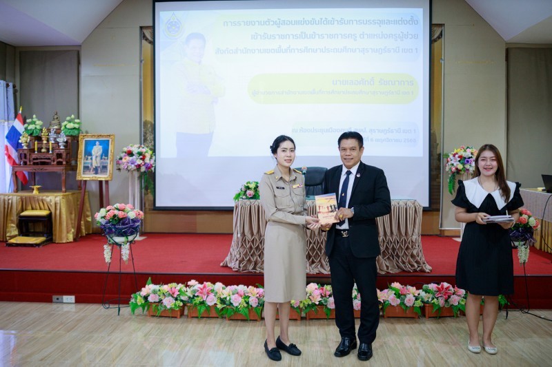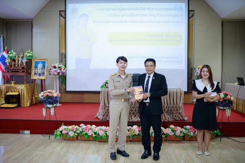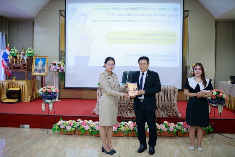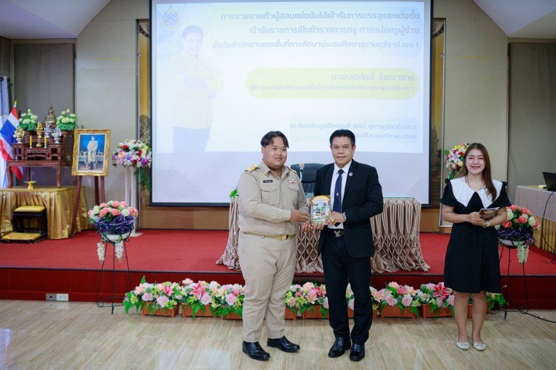 วันที่ 6 พฤศจิกายน 2568 นายเลอศักดิ์ รัชณาการ ผู้อำนวยการสำนักงานเขตพื้นที่การศึกษาประถมศึกษาสุราษฎร์ธานี เขต 1 พร้อมด้วยนายวีระพันธ์ พรมคำน้อย รองผู้อำนวยการสำนักงานเขตพื้นที่การศึกษาประถมศึกษาสุราษฎร์ธานี เขต 1 และบุคลากรกลุ่มบริหารงานบุคคล ร่วมแสดงความยินดีและให้โอวาทในการทำงานเป็นข้าราชการที่ดีแก่ข้าราชการครูและบุคลากรทางการศึกษา ตำแหน่งครูผู้ช่วย สังกัดสำนักงานคณะกรรมการการศึกษาขั้นพื้นฐาน ปี พ.ศ. 2568 จำนวน 21 ราย ณ ห้องประชุมเมืองคนดี สำนักงานเขตพื้นที่การศึกษาประถมศึกษาสุราษฎร์ธานี เขต 1