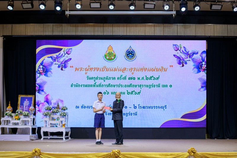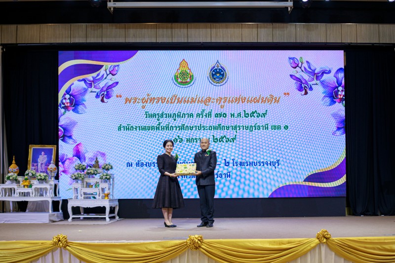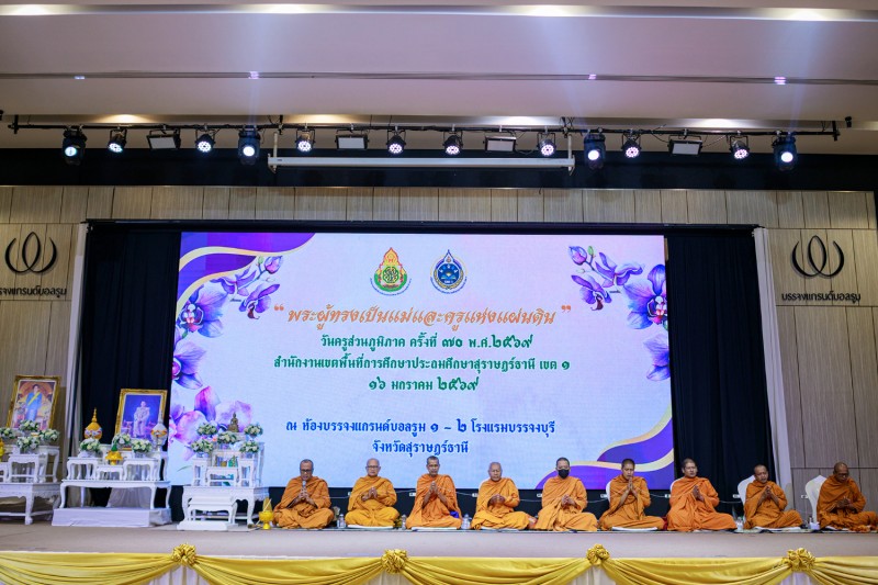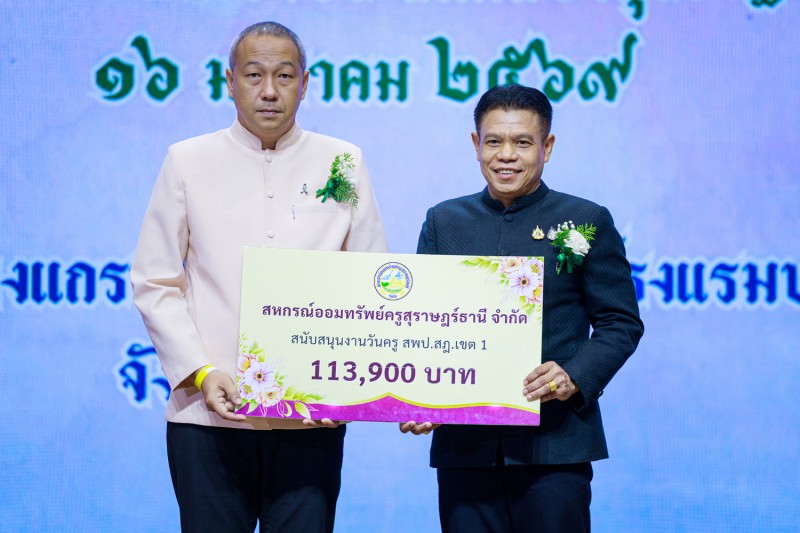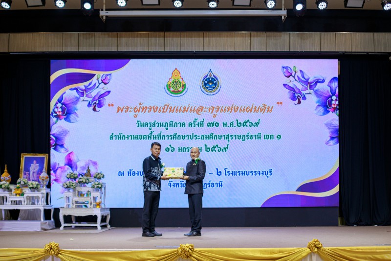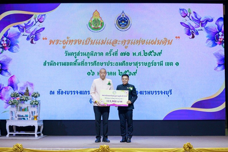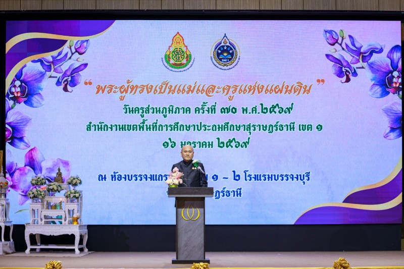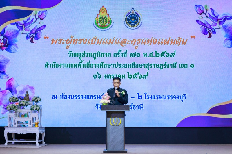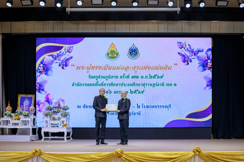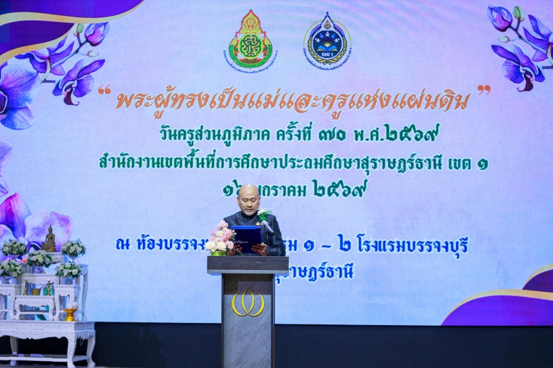 วันที่ 16 มกราคม 2569 นายเลอศักดิ์ รัชณาการ ผู้อำนวยการสำนักงานเขตพื้นที่การศึกษาประถมศึกษาสุราษฎร์ธานี เขต 1 พร้อมด้วยนายสมใจ สิกขวัฒน์, นายวีระพันธ์ พรมคำน้อย, นายสมบัติ ปัญญาคง รองผู้อำนวยการสำนักงานเขตพื้นที่การศึกษาประถมศึกษาสุราษฎร์ธานี เขต 1 ผู้อำนวยการกลุ่มทุกกลุ่ม ผู้บริหารสถานศึกษา ข้าราชครูและบุคลากรทางการศึกษา ร่วมงานวันครูส่วนภูมิภาค ครั้งที่ 70 พ.ศ. 2569 “พระผู้ทรงเป็นแม่และครูแห่งแผ่นดิน” หน่วย : สำนักงานเขตพื้นที่การศึกษาประถมศึกษาสุราษฎร์ธานี เขต 1 โดยมีนายกล้าณรงค์ ยุติธรรม รองผู้ว่าราชการจังหวัดสุราษฎร์ธานีเป็นประธาน ซึ่งมีผู้เข้าร่วมงาน จำนวน 900 คน โดยมีข้าราชการครูและบุคลากรเข้ารับมอบเกียรติบัตรยกย่องเชิดชูเกียรติ จำนวน 265 รางวัล ในการจัดงานผู้ร่วมสนับสนุนงบประมาณ คือ สหกรณ์ออมทรัพย์ครูสุราษฎร์ธานี และ สำนักงาน สกสค.จังหวัดสุราษฎร์ธานี ณ โรงแรมบรรจงบุรี จังหวัดสุราษฎร์ธานี
