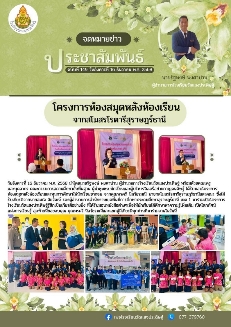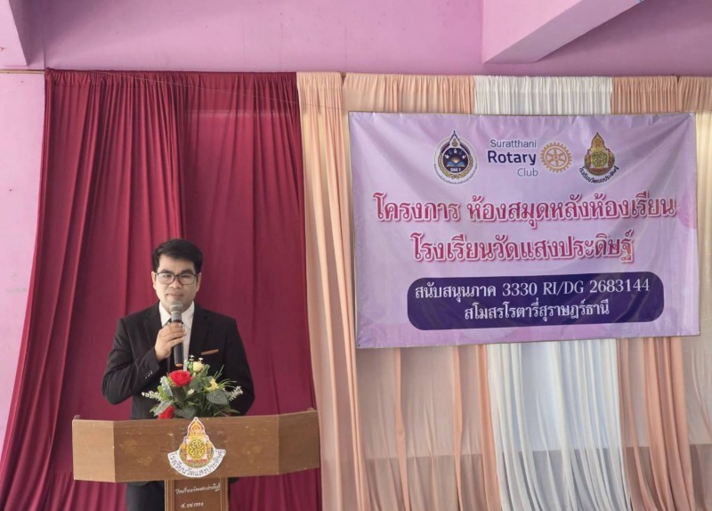 วันที่ 16 ธันวาคม 2568 นายเลอศักดิ์ รัชณาการ ผู้อำนวยการสำนักงานเขตพื้นที่การศึกษาประถมศึกษาสุราษฎร์ธานี เขต 1 มอบหมายให้นายสมใจ สิกขวัฒน์ รองผู้อำนวยการสำนักงานเขตพื้นที่การศึกษาประถมศึกษาสุราษฎร์ธานี เขต 1 ร่วมเป็นเกียรติในพิธีมอบห้องสมุด โครงการห้องสมุดหลังห้องเรียน จากสโมสรโรตารีสุราษฎร์ธานี เพื่อให้นักเรียนได้ศึกษาหาความรู้เพิ่มเติม เปิดโลกทัศน์แห่งการเรียนรู้ ณ โรงเรียนวัดแสงประดิษฐ์