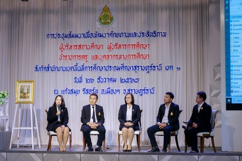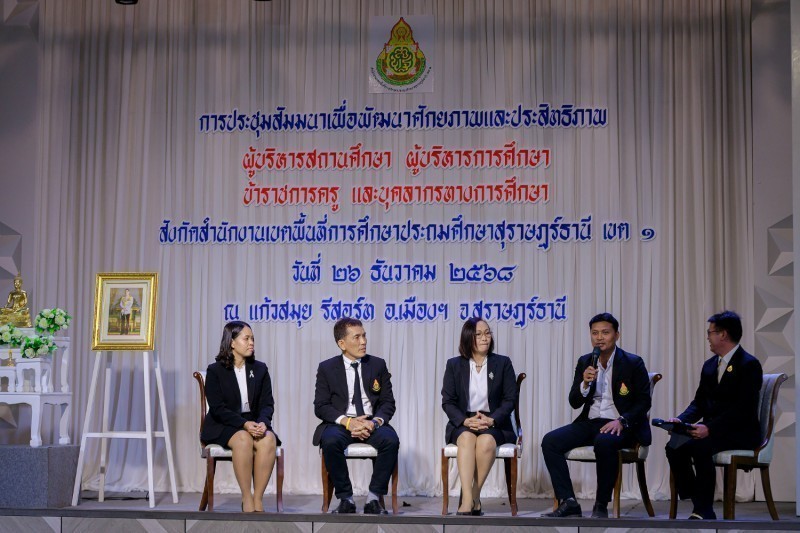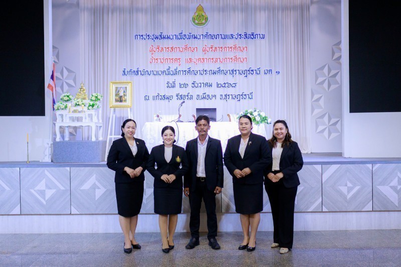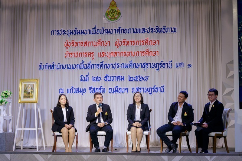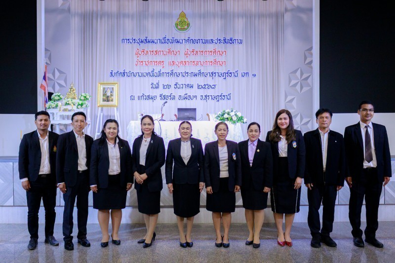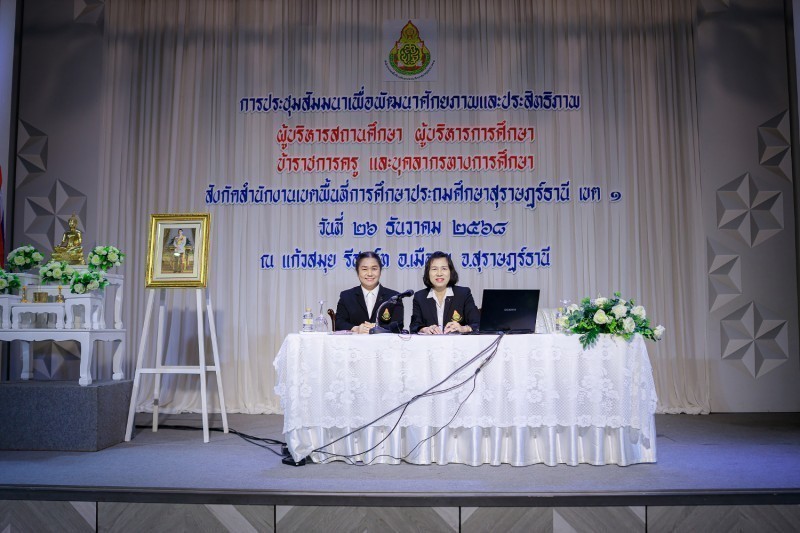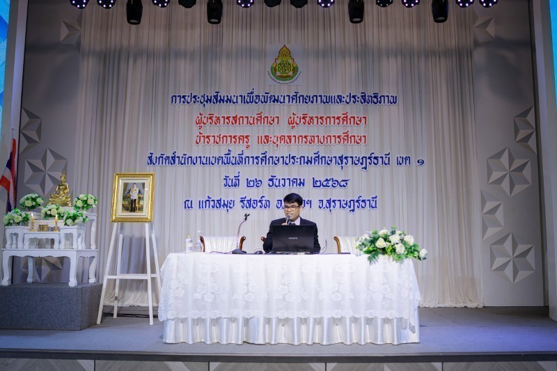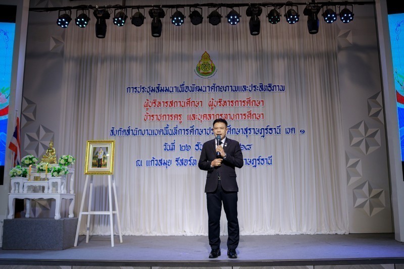 วันที่ 26 ธันวาคม 2568 นายเลอศักดิ์ รัชณาการ ผู้อำนวยการสำนักงานเขตพื้นที่การศึกษาประถมศึกษาสุราษฎร์ธานี เขต 1 เป็นประธานการประชุมสัมมนาเพื่อพัฒนาศักยภาพและประสิทธิภาพ สำหรับผู้บริหารการศึกษา ผู้บริหารสถานศึกษา ข้าราชการครู และบุคลากรทางการศึกษา สังกัดสำนักงานเขตพื้นที่การศึกษาประถมศึกษาสุราษฎร์ธานี เขต 1 ครั้งที่ 1 โดยมีวัตถุประสงค์เพื่อให้ผู้บริหารการศึกษา ผู้อำนวยการกลุ่ม ศึกษานิเทศก์ ผู้อำนวยการโรงเรียน รองผู้อำนวยการโรงเรียน สังกัดสำนักงานเขตพื้นที่การศึกษาประถมศึกษาสุราษฎร์ธานี เขต 1 ได้รับทราบนโยบาย จุดเน้น และแนวทางการปฏิบัติงานในการพัฒนาคุณภาพการศึกษาของกระทรวงศึกษาธิการ และสำนักงานคณะกรรมการการศึกษาขั้นพื้นฐาน ส่งเสริม สนับสนุน ยกระดับคุณภาพการศึกษา เสริมสร้างความเข้มแข็ง ให้สถานศึกษาในสังกัด สามารถขับเคลื่อนแผนงาน/โครงการ ให้บรรลุเป้าหมายของสำนักงานเขตพื้นที่การศึกษาต่อไป กลุ่มเป้าหมาย คือ ผู้บริหารการศึกษา ผู้อำนวยการกลุ่ม ศึกษานิเทศก์ ผู้อำนวยการโรงเรียน รองผู้อำนวยการโรงเรียน รักษาการผู้อำนวยการโรงเรียน และเจ้าหน้าที่ผู้รับผิดชอบที่เกี่ยวข้อง รวมจำนวน 185 คน ณ แก้วสมุยรีสอร์ท อำเภอเมืองสุราษฎร์ธานี จังหวัดสุราษฎร์ธานี