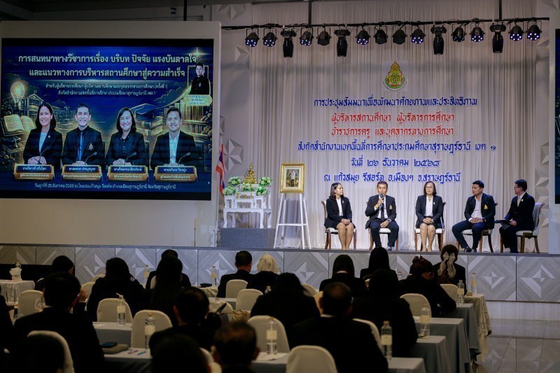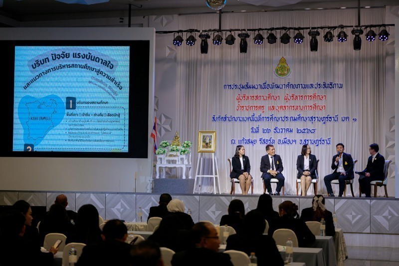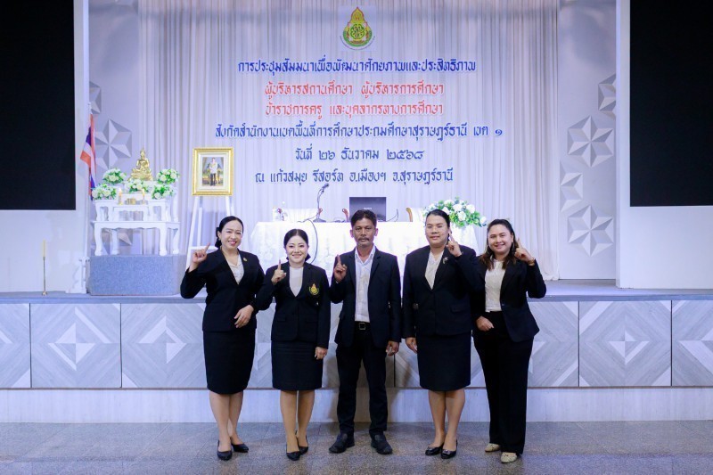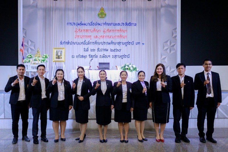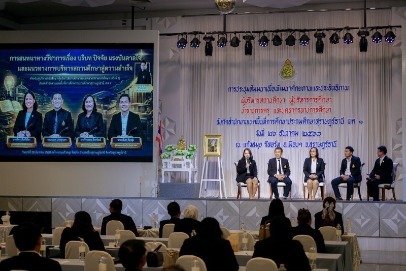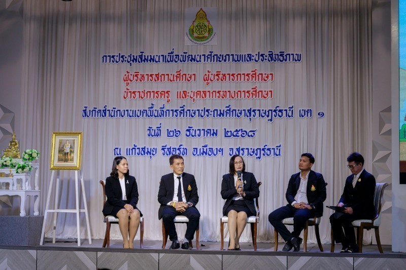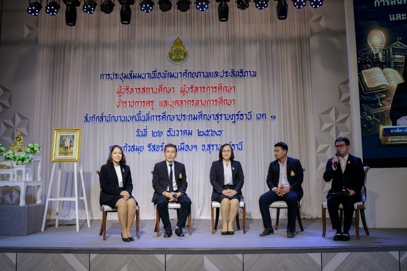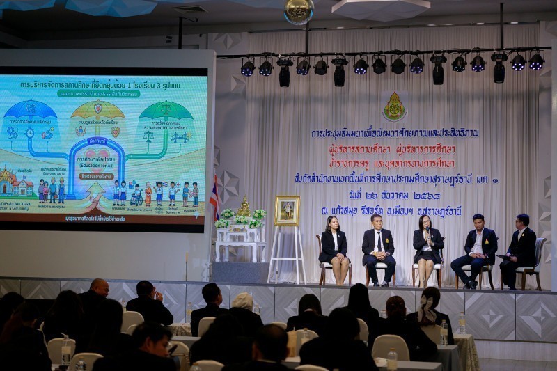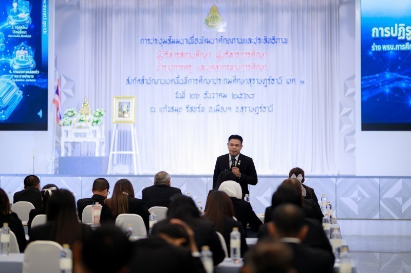 วันที่ 26 ธันวาคม 2568 นายเลอศักดิ์ รัชณาการ ผู้อำนวยการสำนักงานเขตพื้นที่การศึกษาประถมศึกษาสุราษฎร์ธานี เขต 1 เป็นประธานการประชุมสัมมนาเพื่อพัฒนาศักยภาพและประสิทธิภาพ สำหรับผู้บริหารการศึกษา ผู้บริหารสถานศึกษา ข้าราชการครู และบุคลากรทางการศึกษา สังกัดสำนักงานเขตพื้นที่การศึกษาประถมศึกษาสุราษฎร์ธานี เขต 1 ครั้งที่ 1 โดยมีวัตถุประสงค์เพื่อให้ผู้บริหารการศึกษา ผู้อำนวยการกลุ่ม ศึกษานิเทศก์ ผู้อำนวยการโรงเรียน รองผู้อำนวยการโรงเรียน สังกัดสำนักงานเขตพื้นที่การศึกษาประถมศึกษาสุราษฎร์ธานี เขต 1 ได้รับทราบนโยบาย จุดเน้น และแนวทางการปฏิบัติงานในการพัฒนาคุณภาพการศึกษาของกระทรวงศึกษาธิการ และสำนักงานคณะกรรมการการศึกษาขั้นพื้นฐาน ส่งเสริม สนับสนุน ยกระดับคุณภาพการศึกษา เสริมสร้างความเข้มแข็ง ให้สถานศึกษาในสังกัด สามารถขับเคลื่อนแผนงาน/โครงการ ให้บรรลุเป้าหมายของสำนักงานเขตพื้นที่การศึกษาต่อไป กลุ่มเป้าหมาย คือ ผู้บริหารการศึกษา ผู้อำนวยการกลุ่ม ศึกษานิเทศก์ ผู้อำนวยการโรงเรียน รองผู้อำนวยการโรงเรียน รักษาการผู้อำนวยการโรงเรียน และเจ้าหน้าที่ผู้รับผิดชอบที่เกี่ยวข้อง รวมจำนวน 185 คน ณ แก้วสมุยรีสอร์ท อำเภอเมืองสุราษฎร์ธานี จังหวัดสุราษฎร์ธานี