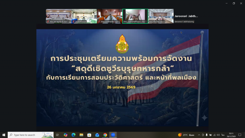 วันที่ 26 มกราคม 2569 นายเลอศักดิ์ รัชณาการ ผู้อำนวยการสำนักงานเขตพื้นที่การศึกษาประถมศึกษาสุราษฎร์ธานี เขต 1 มอบหมายให้นายวีระพันธ์ พรมคำน้อย รองผู้อำนวยการสำนักงานเขตพื้นที่การศึกษาประถมศึกษาสุราษฎร์ธานี เขต 1 พร้อมด้วยผู้อำนวยการกลุ่มนิเทศ ติดตามและประเมินผลการจัดการศึกษา ผู้อำนวยการกลุ่มอำนวยการ และบุคลากรที่เกี่ยวข้อง เข้าร่วมประชุมการดำเนินงานจัดงาน “สดุดีเชิดชูวีรบุรุษทหารกล้า” ผ่านระบบ Zoom Meetings โดยมีวัตถุประสงค์เพื่อแสดงความอาลัยและรำลึกถึงทหารกล้าผู้เสียชีวิตจากการปะทะบริเวณชายแดนไทย - กัมพูชา อันเป็นการปฏิบัติหน้าที่ด้วยความกล้าหาญและเสียสละชีวิตเพื่อปกป้องอธิปไตยของประเทศชาติตลอดจนเป็นการยกย่องเชิดชูเกียรติคุณของทหารกล้าผู้สละชีพในการปฏิบัติหน้าที่ อันสมควรได้รับการจารึกไว้เป็นแบบอย่างแห่งความเสียสละ ความจงรักภักดี และความภาคภูมิใจของคนไทยทั้งชาติ และเพื่อถอดบทเรียนเพื่อเป็นกรณีศึกษาและตัวอย่างการทำความดี ความเสียสละ และความรักชาติแก่นักเรียน สู่การบูรณาการการจัดการเรียนการสอนประวัติศาสตร์ชาติไทยและหน้าที่พลเมือง ณ ห้องประชุมธารตาปี สำนักงานเขตพื้นที่การศึกษาประถมศึกษาสุราษฎร์ธานี เขต 1