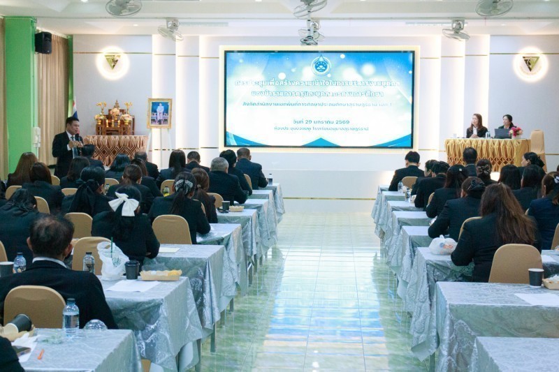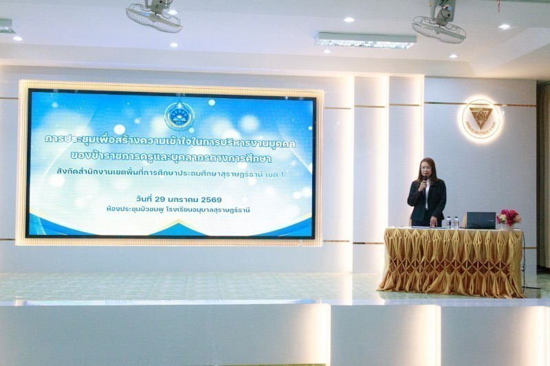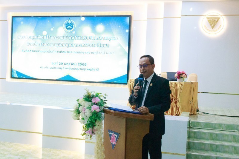 วันที่ 29 มกราคม 2569 นายเลอศักดิ์ รัชณาการ ผู้อำนวยการสำนักงานเขตพื้นที่การศึกษาประถมศึกษาสุราษฎร์ธานี เขต 1 พร้อมด้วยคณะบุคลากรสำนักงานเขตพื้นที่การศึกษา ผู้อำนวยการสถานศึกษา ร่วมการประชุมเพื่อสร้างความรู้ความเข้าใจในการบริหารงานบุคคล ของข้าราชการครูและบุคลากรทางการศึกษา สังกัดสำนักงานเขตพื้นที่การศึกษาประถมศึกษาสุราษฎร์ธานี เขต 1 โดยมีนางสาวเจริญวรรณ หนูนาค ประธาน อ.ก.ค.ศ.เขตพื้นที่การศึกษาประถมศึกษาสุราษฎร์ธานี เขต 1 เป็นประธาน ณ โรงเรียนอนุบาลสุราษฎร์ธานี