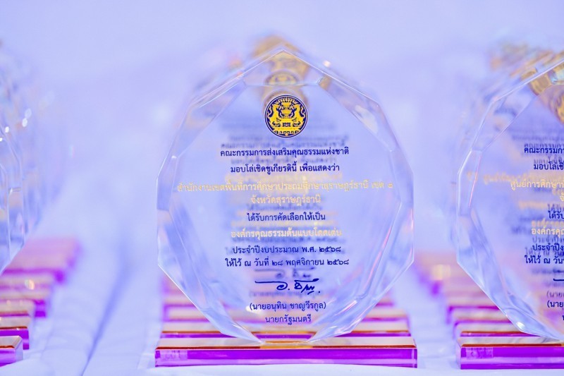 วันที่ 5 กุมภาพันธ์ 2569 นายเลอศักดิ์ รัชณาการ ผู้อำนวยการสำนักงานเขตพื้นที่การศึกษาประถมศึกษาสุราษฎร์ธานี เขต 1 มอบหมายให้นางดวงมณี ฉิมพลี ผู้อำนวยการกลุ่มอำนวยการ เข้ารับโล่เชิดชูเกียรติแก่สำนักงานเขตพื้นที่การศึกษาประถมศึกษาสุราษฎร์ธานี เขต 1 จากคณะกรรมการส่งเสริมคุณธรรมแห่งชาติ ให้เป็น “องค์กรคุณธรรมต้นแบบโดดเด่น” ประจำปีงบประมาณ พ.ศ. 2568 โดยมีนายบวรศักดิ์ อุวรรณโณ รองนายกรัฐมนตรี เป็นประธานในพิธี ณ ห้องนิทรรศการ 5 ชั้น 1 อาคารหอศิลป์แห่งชาติ กระทรวงวัฒนธรรม