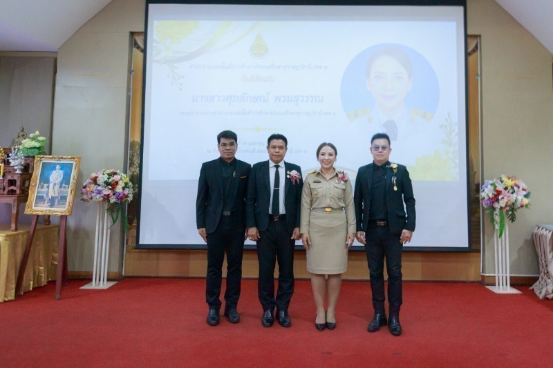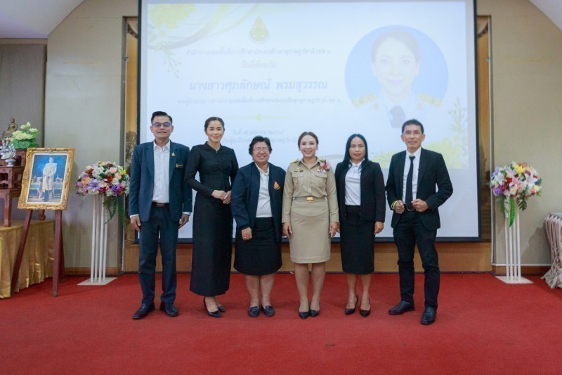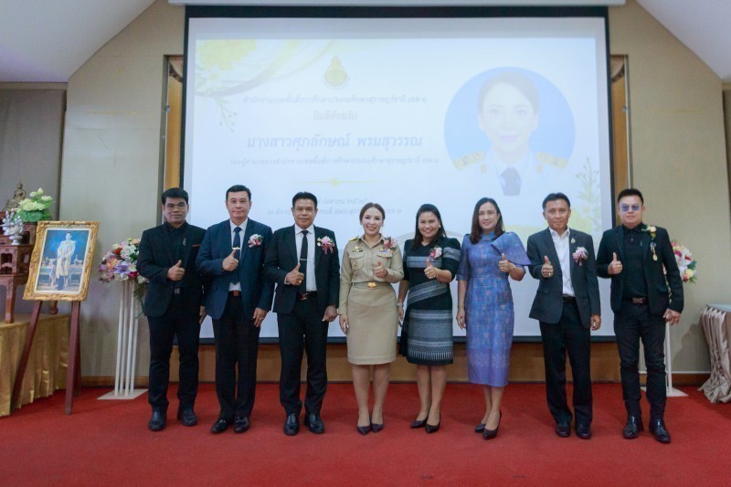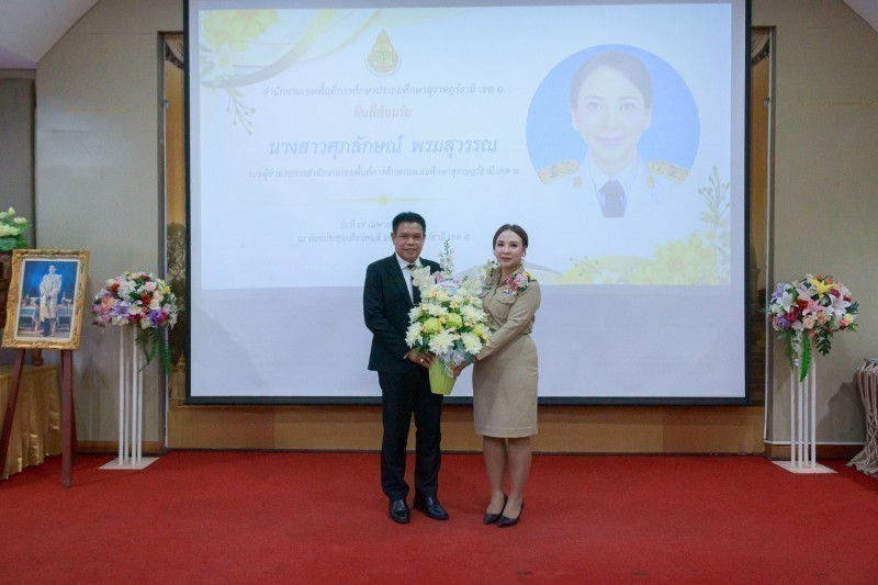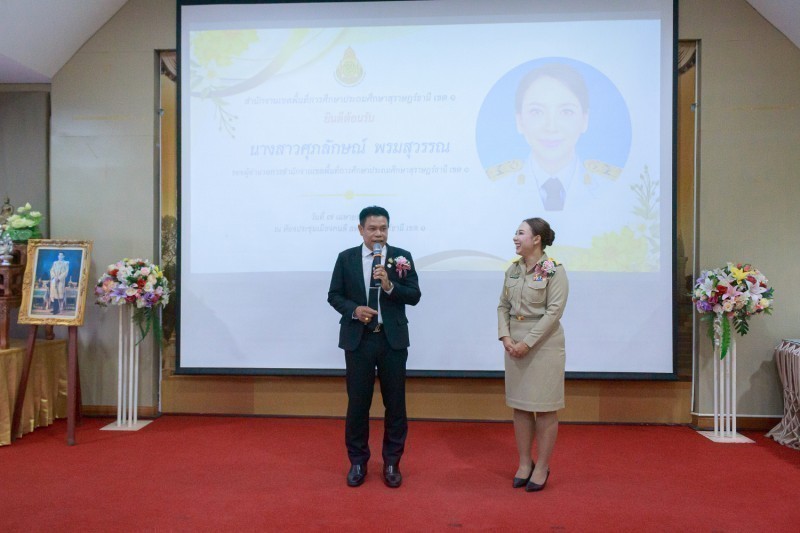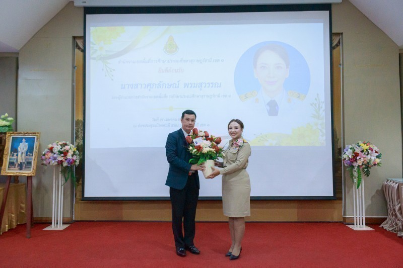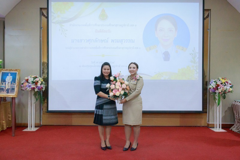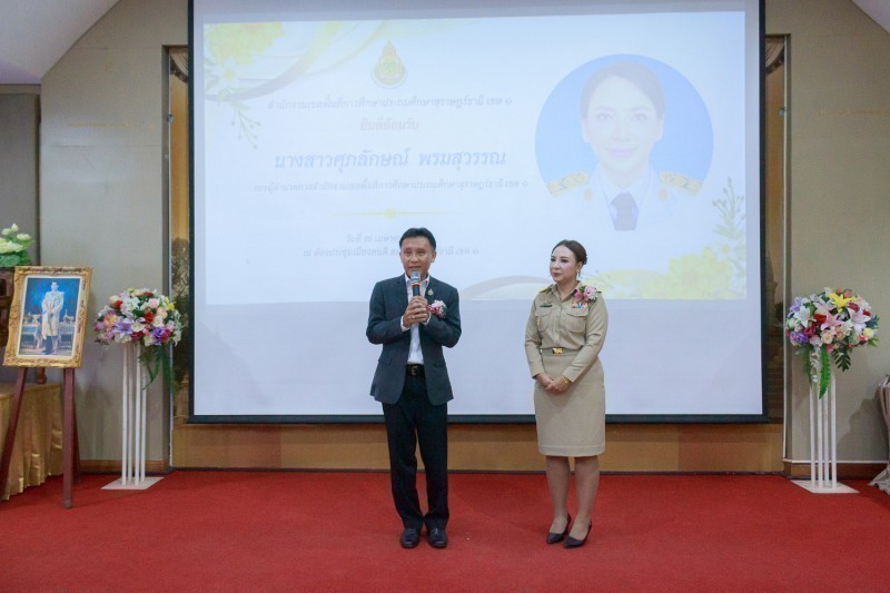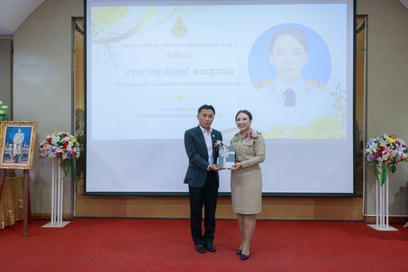 วันที่ 7 เมษายน 2569 นายเลอศักดิ์ รัชณาการ ผู้อำนวยการสำนักงานเขตพื้นที่การศึกษาประถมศึกษาสุราษฎร์ธานี เขต 1 พร้อมด้วยนายสมใจ สิกขวัฒน์, นายสมบัติ ปัญญาคง รองผู้อำนวยการสำนักงานเขตพื้นที่การศึกษาประถมศึกษาสุราษฎร์ธานี เขต 1 ผู้อำนวยการกลุ่ม บุคลากรสำนักงานเขตพื้นที่การศึกษา ผู้บริหารสถานศึกษา ข้าราชการครูและบุคลากรทางการศึกษา และแขกผู้มีเกียรติ ร่วมต้อนรับและแสดงความยินดีแก่นางสาวศุภลักษณ์ พรมสุวรรณ เนื่องในโอกาสบรรจุและแต่งตั้งให้ดำรงตำแหน่ง รองผู้อำนวยการสำนักงานเขตพื้นที่การศึกษาประถมศึกษาสุราษฎร์ธานี เขต 1 ณ ห้องประชุมเมืองคนดี สำนักงานเขตพื้นที่การศึกษาประถมศึกษาสุราษฎร์ธานี เขต 1